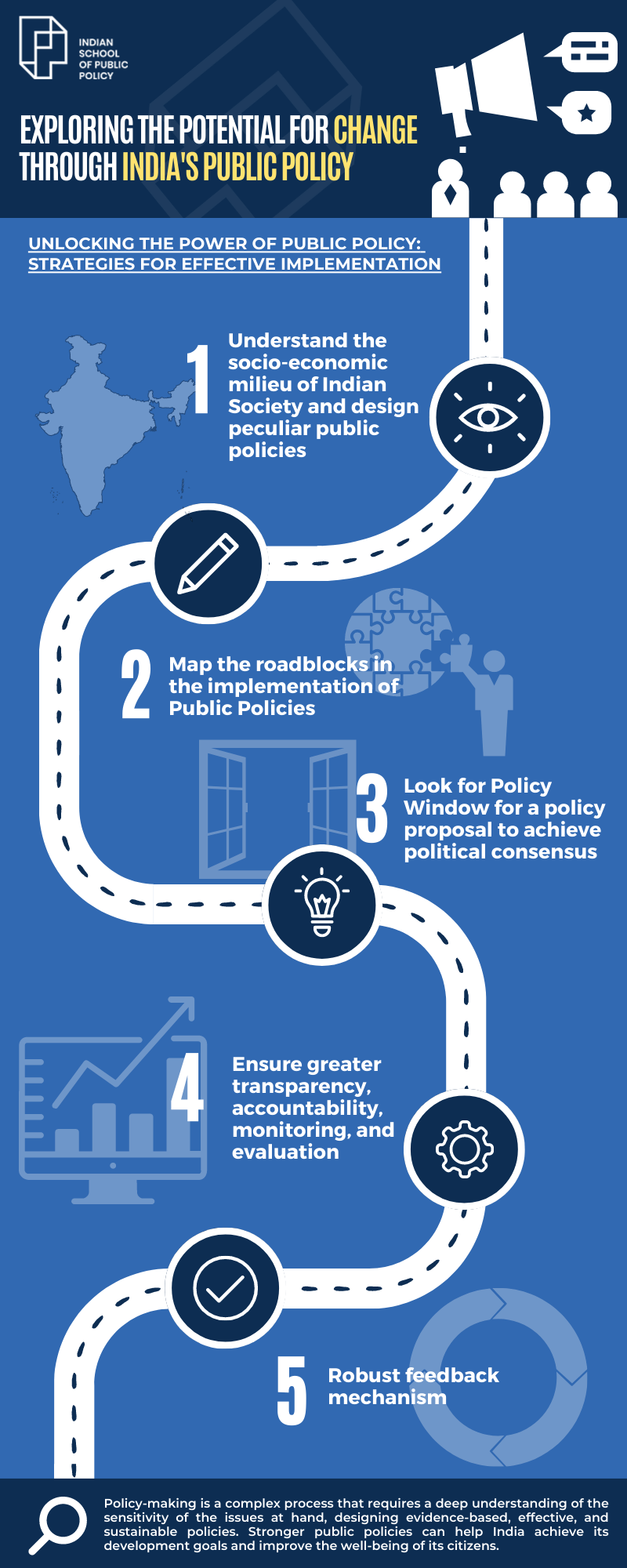 Professionals have a critical role in designing more robust public policies for India. Policy-making is a complex process that requires a deep understanding of the sensitivity of the issues at hand, designing evidence-based, effective, and sustainable policies, the context in which the new policies are being implemented, and measuring their impacts. Effective policy development demands careful analysis of different options, drawing on available evidence. Moreover, designing and implementing public policies require a range of skills that can help ensure that the efficient implementation of policies reaches the intended beneficiaries.