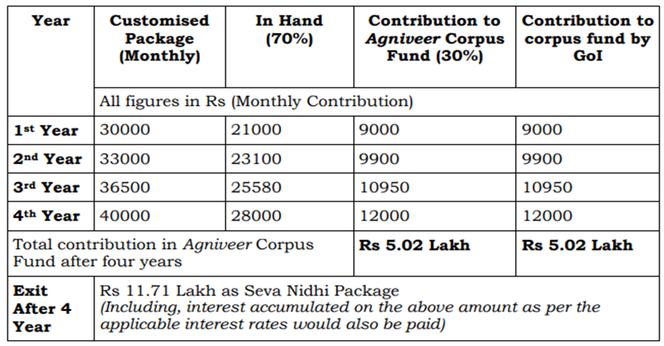 Initially, a Jawan’s salary was Rs. 30,000 for a long period of time but with Agnipath, the salary would increase to Rs. 40,000 in the fourth year. An MOU has been signed with IGNOU to provide a bachelor’s degree to all Agniveers. They will get about Rs. 11.71 lakhs (50-50 contribution by Jawan and the government) at the time of retirement. Apart from this, Agniveer can also take a loan of up to Rs. 18 lacs for three years. There is a life insurance cover of Rs 48 lakhs. A one-time compensation of 44, 25, and 15 lakhs for 100 percent, 75 percent, and 50 percent disability respectively with increased wages and a multitude of other benefits. (As shown in the table)