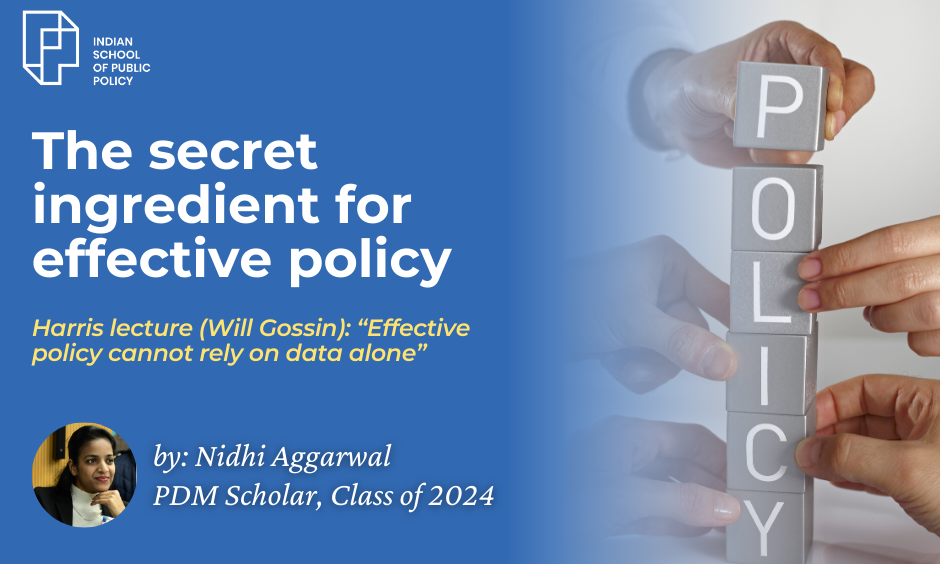 Harris lecture (Will Gossin): “Effective policy cannot rely on data alone” Why do we need innovation in public policy? Public policy is incomplete without ‘public’ – the humans making it and being impacted by it. Hence, public policy should be human-centric. The case study of laying pipelines in a village leading to dissatisfaction among the… Continue reading The secret ingredient for effective policy