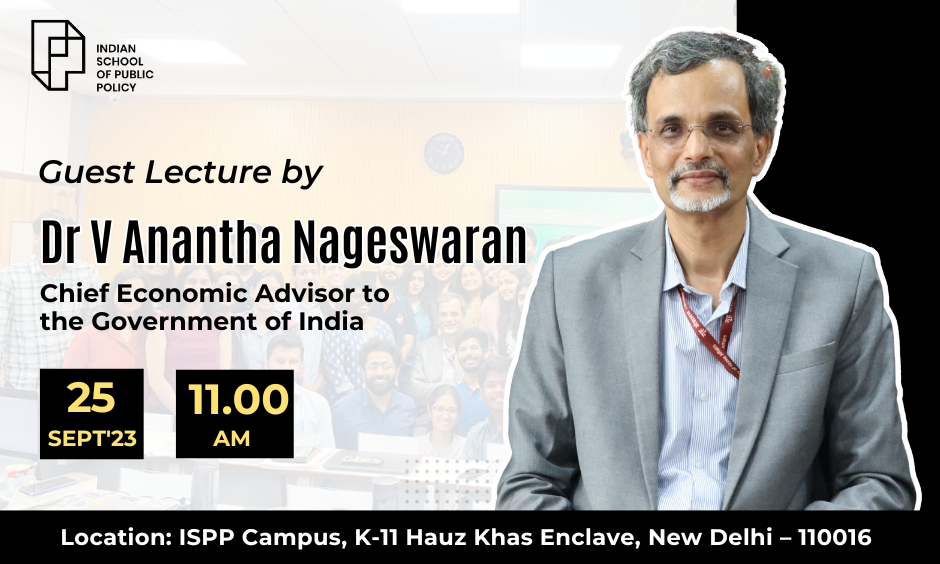Indian School of Public Policy (ISPP) had the distinct honour of welcoming a renowned economist, visionary leader and distinguished guest who stands as a beacon of expertise and leadership in the realm of economics. We had the wonderful opportunity of getting graced by none other than Dr V. Anantha Nageswaran, the Chief Economic Advisor to the Government of India. He delivered a talk on the topic “Navigating the Present for a Sustainable Future.”