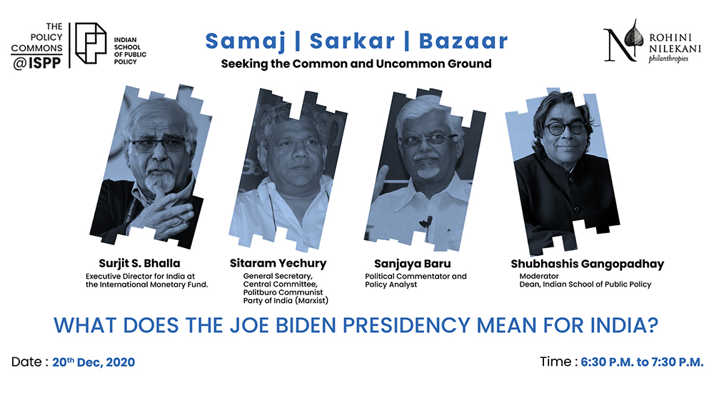 The second session of the Policy Commons at ISPP, “What does the Biden presidency mean for India” will bring together eminent speakers from the civil society, state, and market to discuss the implications of the Biden presidency on India. The session will be moderated by Dr. Shubhashis Gangopadhyay, Economist and Dean, Indian School of Public Policy. The speakers for the session are: