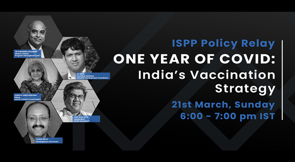 The Indian School of Public Policy invites you to its upcoming session of ISPP Policy Relay 2021 to mark one year of Covid-19 in India. The panel will be discussing India’s Vaccination Strategy in this session.