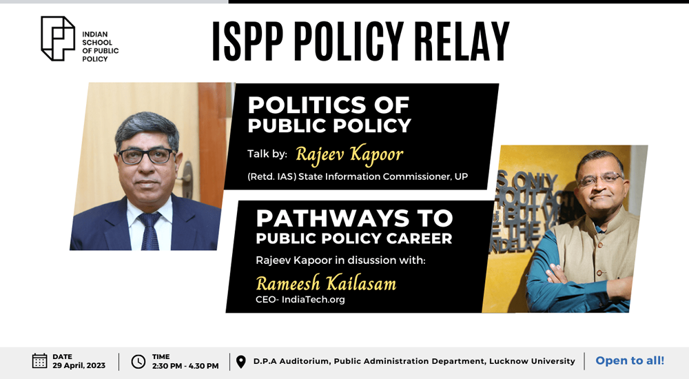 Our upcoming event in Lucknow will provide you with a taste of what ISPP has to offer. We will be holding a session on the “Politics of Public Policy and Pathways to Public Policy Careers.” Please see below for details: