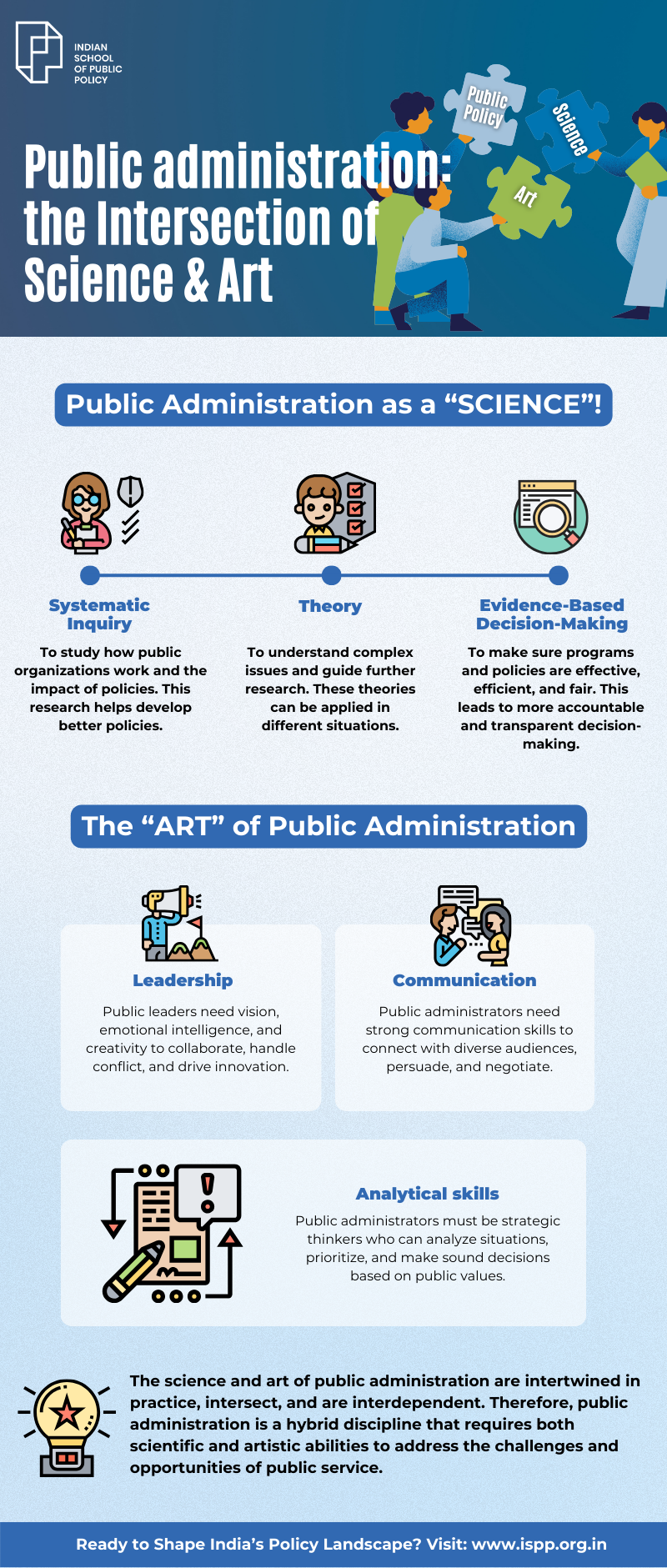 Public administration involves a scientific study and application of systematic systems and principles to manage governmental agencies, programmes, and policies effectively. However, the extension of its application requires practitioners to be adaptable while using creativity in their approach to address complex issues and manage public resources. Their judgments and decision-making should be able to withstand the dynamic environment while engaging with stakeholders. Thus, administrators should be well rounded to have an understanding of the scientific aspects of Public Administration and also possess the art of leadership, communication, and other soft skills. Effective governance can only be an amalgam of science and art, if one may call it.