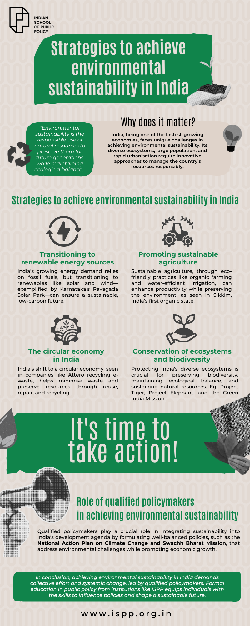 Achieving environmental sustainability in India is a multifaceted challenge that requires the collective effort of individuals, businesses, and governments. Whether through renewable energy, sustainable agriculture, a circular economy, or conservation initiatives, India is taking meaningful steps toward sustainability. However, systemic change can only be realised through the work of well-qualified policymakers who design and implement effective policies.